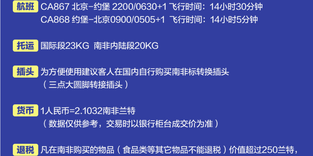 | 5:30于北京首都机场三号航站楼集合。由首都机场三号航站楼搭乘中国国际航空公司航班,经停深圳宝安国际机场,行李直达,停留约1小时50分,飞往南非最大的城市-约翰内斯堡。CA867(北京/深圳18:50/22:30 深圳/约堡00:20+1/0805+1,飞行时长约18小时35分) |