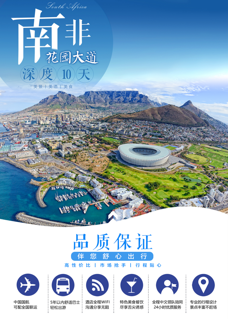 | (开普敦约翰内斯堡飞行约2小时10分钟;约翰内斯堡北京飞行约13小时30分)4酒店早餐后送至机场10:25 搭乘中国国际航空CA868返回北京,翌日清晨抵达备注:航班CA868经停深圳,旅客需下机,随身行李重新二次安检;托运行李可直挂北京 |