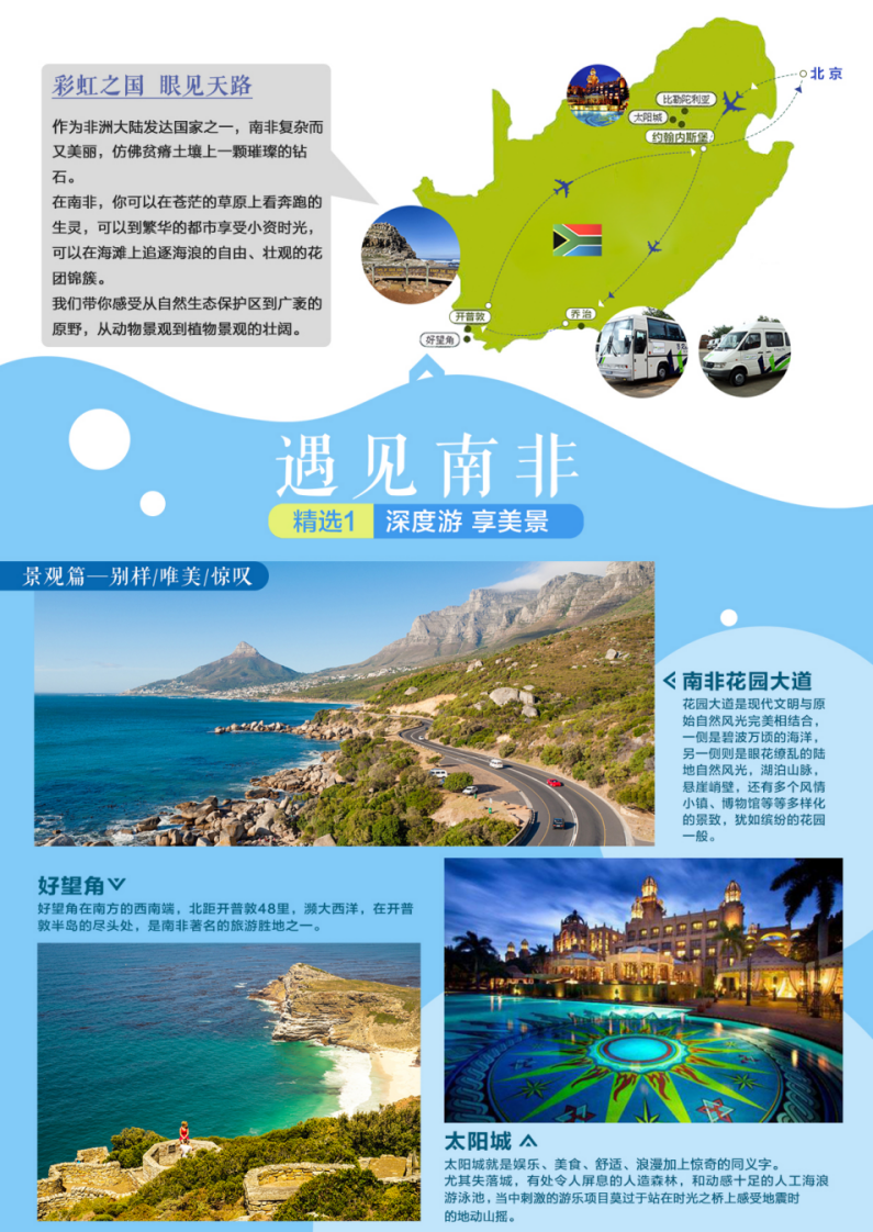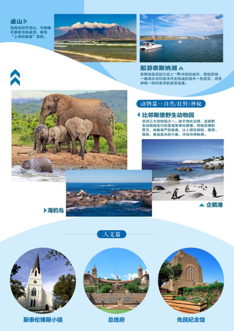 | (开普敦约翰内斯堡飞行约2小时10分钟)4早餐后,乘船出海游【海豹岛】(视天气情况而定,约45分钟左右,不上岛),看成千上万只海豹戏水、嬉戏;4乘车前往开普敦著名【桌山(含360度旋转缆车上下山)】(游览约2小时),在这里我们俯瞰繁华都市,开普敦美景尽收眼底;【备注:如因天气原因不能登顶缆车关闭,则根据实际情况调整游览时间或乘车前往信号山(游览时间:40分钟左右),远观桌山,桌山缆车费用不退,请提前知晓,谢谢理解】特别说明:因桌山缆车绳索大规模维护,于2019年7月8日至8月18日境外期间桌山景区关闭,更换开普敦植物园景区作为更换景点。4前往著名的小工艺品店挑选精美的非洲手工艺品(约2小时);特别提醒:南非工艺品多为动物制品,此类商品在南非为合法出口,并可提供检验检疫证书,但此类商品在中国为禁止入境商品,海关查出会扣留,在您购买时,请自行斟酌。4之后参观南非最古老的街心花园,最著名的乔治大教堂(外观),2010年南非世界杯比赛场地【绿点球场-GREEN POINT】(外观30分钟)。4搭乘内陆航班返回约翰内斯堡,抵达后入住酒店休息。 |