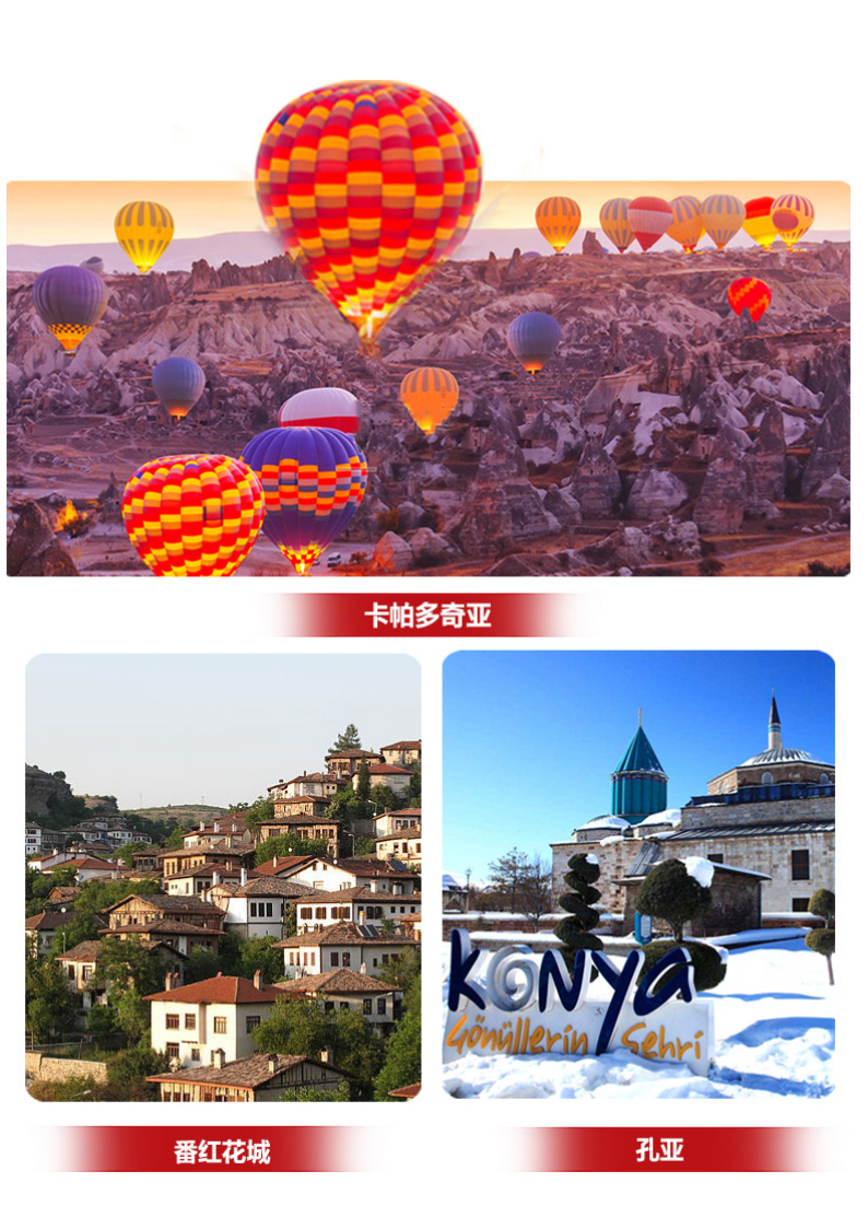 | 早餐后,前往土耳其最古老的城市之—孔亚,12至13世纪曾为塞尔柱的首都,是土耳其传统的宗教文化中心。午餐后,前往旋转舞的始祖纪念馆—梅夫拉那博物馆参观(约1小时),“梅夫拉那”意为“我的师父”,指的是以旋转舞闻名于世的梅夫拉那教创始人杰拉尔丁·鲁米,他是土耳其的宗教领袖、创始人,旋转舞的发明者,他的陵墓在博物馆内,因此命名。参观后接着行驶在丝绸之路上,经停古驿站(外观),继续行程前往曾被美国《国家地理》杂志社评选为“十大地球美景”之一的卡帕多奇亚。早在波斯帝国时期,由于卡帕多奇亚人向波斯人进贡了健壮的马匹和技艺精湛的金银工匠,波斯人把这里叫做“卡帕多奇亚”,其寓意就是美丽的马乡。抵达晚餐之后入住酒店休息。小贴士:安塔利亚-孔亚的正常行车时间约5个小时,孔亚-卡帕多奇亚的正常行车时间约3个小时 |