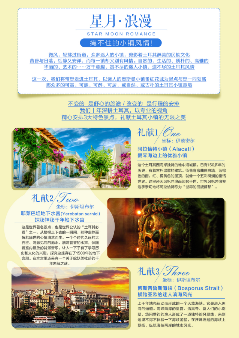 | 酒店早餐后,乘车前往游览【地下水宫】——伊斯坦布尔最浪漫、最神秘的景点之一。宫内两根“美杜莎头像之柱”至今仍是不解之谜,而地下水宫也正因其神秘感而被游人所追捧。好莱坞大片《007 在伊斯坦布尔》和成龙的电影《特务迷城》都曾在这里取景。之后前往【圣索非亚大教堂】(入内约1小时)【圣索菲亚教堂逢周一休息,如遇关闭,则前后调整一天参观】。午餐特别安排博斯普鲁斯海峡餐厅用特色烤鱼!午餐后,游览【托普卡泊老皇宫】(游览约1.5小时),托普卡泊宫是奥斯曼帝国时期的皇宫。它是奥斯曼帝国的政治中心,伊斯坦布尔托普卡泊宫每天约有五千人来这里参观,每年接待参观者达二百五十万人,它是欧洲参观人数最多的博物馆,是今天伊斯坦布尔最重要的历史古迹之一。【老皇宫逢周二不接受参观,如遇关闭,则前后调整一天参观】。【古罗马竞技场】以及【埃及方尖碑】(外观约10分钟)。【蓝色清真寺】(游览约30分钟)苏丹艾哈迈德清真寺是土耳其的国家清真寺,也是土耳其最大城市及奥斯曼帝国首都伊斯坦布尔的清真寺古迹。苏丹艾哈迈德清真寺是其中一个因室内砖块所用的颜色而被称为蓝色清真寺的清真寺。苏丹艾哈迈德清真寺建于苏丹艾哈迈德一世统治时的1609年至1616年。 |