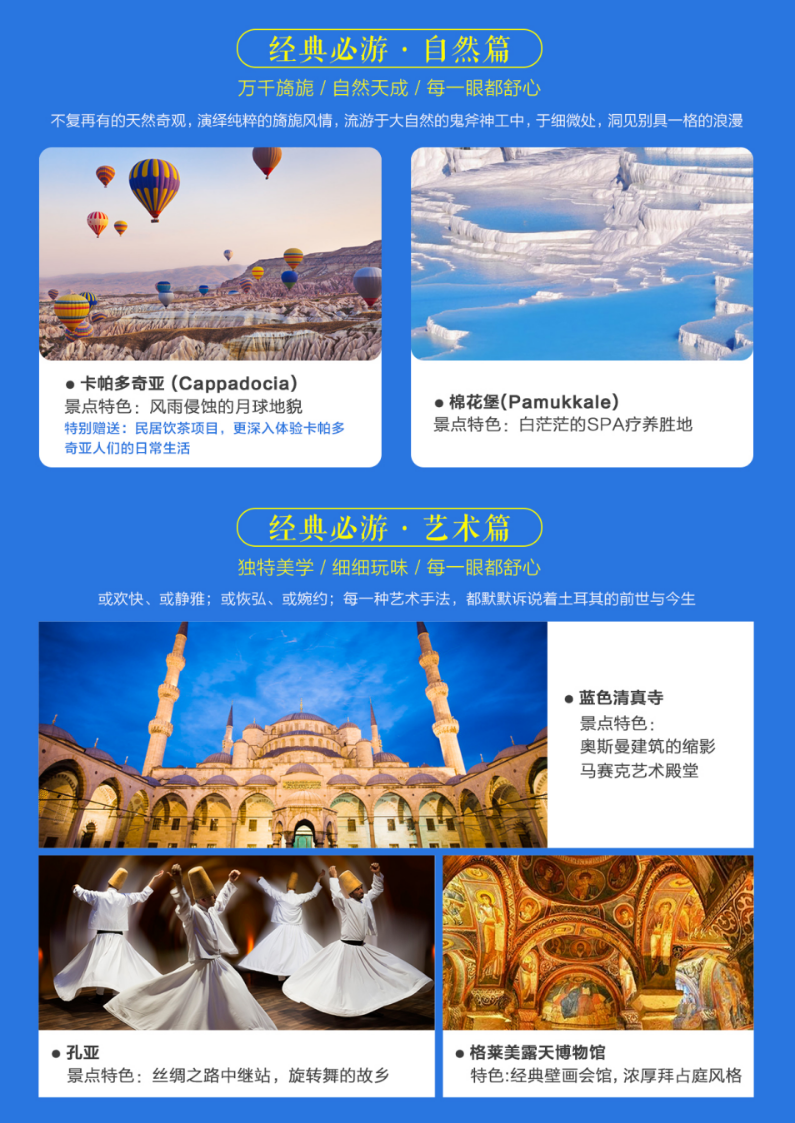 | 酒店早餐后,乘车前往卡帕多奇亚当地民居家中饮茶,体味热情好客的土耳其当地人民的真实生活(约40分钟)。之后参观蘑菇谷,骆驼岩,乌奇萨要塞,猎人谷(共约2小时),【格莱梅露天博物馆】(约1小时)作为土耳其的世界级文化遗产,格莱梅露天博物馆集中了数量众多的装饰着精美壁画的岩窟教堂和清真寺。岩窟教堂的石灰壁画,都是用石灰涂在墙上,在石灰潮湿的时候,把颜料调好后涂在石灰上,壁画的内容以圣经为主。前往当地【地毯店】,选购具有土耳其特色的地毯(约为1.5个小时)。前往【当地陶瓷店】,选购具有土耳其特色的陶瓷(约为1小时)。午餐特别升级洞穴餐厅内享用套陶雍炖肉料理(Uranos Sarikaya)。之后往【珠宝店】,挑选具有土耳其特色的珠宝饰品(约为1.5小时)晚上如有时间可观看土耳其著名的肚皮舞表演。【见行程后附件:行程外可额外购买特色项目】 【热气球购买说明】:1、 由于土耳其热气球名额有限以及天气原因影响,国内随团款报名的热气球客人不能保证一定安排在第一天飞行,因名额已满或者天气原因不能飞行,则原价退还,不承担违约赔偿责任,请提前知晓,谢谢理解!2、 国内报名热气球的客人如因名额已满或天气原因改签棉花堡飞行,费用不退境外签字确认同意改签棉花堡,如不改棉花堡飞行,费用回国后退回,不承担违约赔偿责任,请提前知晓,谢谢理解! |