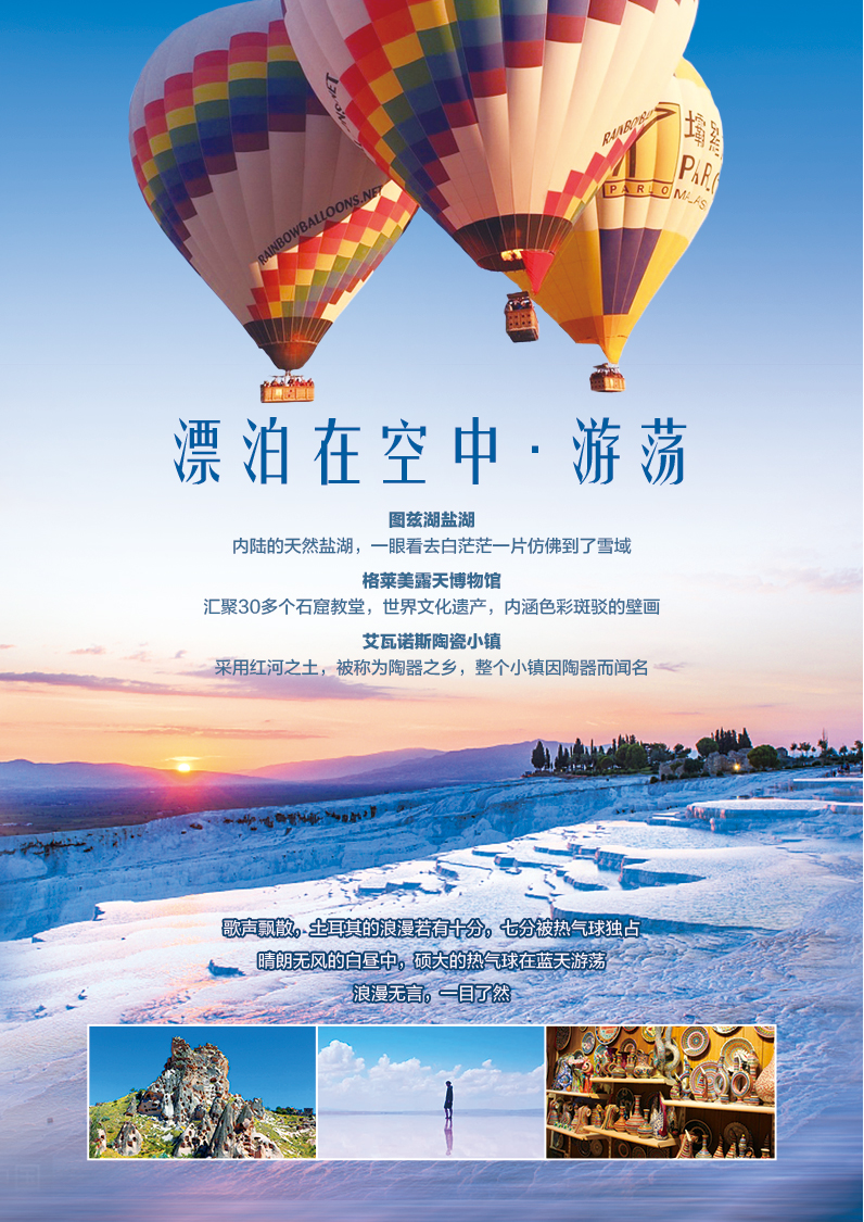 | 酒店早餐后,前往【艾瓦诺斯陶瓷小镇】(约1小时),前往【当地陶瓷店】(约1.5小时),选购具有土耳其特色的陶瓷。下午前往欣赏当地著名的【鸽子谷】(约20分钟),鸽子谷的岩石上布满了密密麻麻的鸽子洞,据说古代人用来收集鸽子粪作肥料,是讲究的天然环保场,山谷之上两颗年头不久的枝叉众多的树上,一棵挂满了蓝眼睛,另一棵则是当地最著名的陶器制品。这里是留影的好地点。前往当地地毯店,选购具有土耳其特色的地毯(约为1.5小时)。4午餐后,下午自由活动(不含车、导游)。晚上如有时间可观看土耳其著名的肚皮舞表演。【见行程后附件:行程外可额外购买特色项目】 【热气球购买说明】: 由于土耳其热气球名额有限以及天气原因影响,国内随团款报名的热气球客人不能保证一定安排在第一天飞行,因名额已满或者天气原因不能飞行,则原价退还,不承担违约赔偿责任,请提前知晓,谢谢理解! 国内报名热气球的客人如因名额已满或天气原因改签棉花堡飞行,费用不退境外签字确认同意改签棉花堡,如不改棉花堡飞行,费用回国后退回,不承担违约赔偿责任,请提前知晓,谢谢理解! |