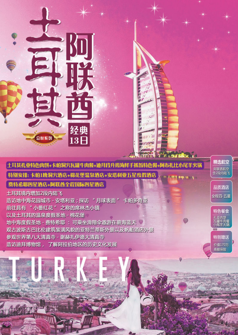 | 参考航班:EK122(1925-0100+1)酒店早餐后,伊斯坦布尔全天自由活动。推荐线路一:伊斯坦布尔半日游:早餐后酒店接客人,前往码头搭乘渡轮游览蓝色的博斯普鲁斯海峡;沿途欣赏伊斯坦布尔城风格各异的老式建筑;横穿欧亚大陆的博斯普鲁斯海峡不仅是重要的海港,也是伊斯坦布尔富人、皇族聚居地区之一;感受玛尔玛拉海峡温润的海风,欣赏海峡两岸建筑风格奇特的豪华别墅;了解奥斯曼帝国贵族生活史;随后前往托普卡帕老皇宫(入内参观大约游览时间约:1小时左右);午餐享用土耳其当地烤肉餐,午餐后结束行程。推荐线路二:伊斯坦布尔一日游:早餐后酒店接客人,前往托普卡帕老皇宫(入内参观大约游览时间约:1小时左右);参观拜占庭建筑中最为突出的圣索菲亚大教堂(入内参观1个小时左右):有近1500年的漫长历史,因其巨大的圆顶而闻名于世,是一幢“改变了建筑史”的拜占庭式建筑典范。午餐享用土耳其当地烤肉餐,午餐后前往码头搭乘渡轮游览蓝色的博斯普鲁斯海峡;沿途欣赏伊斯坦布尔城风格各异的老式建筑;横穿欧亚大陆的博斯普鲁斯海峡不仅是重要的海港,也是伊斯坦布尔富人、皇族聚居地区之一;感受玛尔玛拉海峡温润的海风,欣赏海峡两岸建筑风格奇特的豪华别墅;了解奥斯曼帝国贵族生活史;随后游览位于海峡沿岸的奥斯曼帝国时代的西式皇家宫殿-多玛巴切新皇宫(入内参观大约游览时间约:2小时左右):虽然和欧洲的许多皇宫比起来它的规模并不大,但其奢华程度令人惊叹,由于少有战乱,经过150多年至今仍然保存完好,皇宫内所有物品都是真品,哪怕是一个木门的手柄、窗帘、地毯依然是当年的物品。随后前往佩拉宫想用悠闲下午茶——重温东方快车年代的美好:土耳其最具代表性的旅店就是佩拉宫,它是土耳其第一个有电梯有热水的地方,也是土耳其第一次办时装秀的地方... ...很多土耳其的第一次都在这里发生。至今该饭店保留了原有的结构,十九世纪末的风华营造到了极致,咖啡厅高耸又能调节气候的天窗、黑白的大理石地板、过往东方快车乘客流连的酒吧。旅店的空间弥漫时光的气味,甚至下午茶使用的银器都是百年前留下来的。下午茶后结束一日游行程。傍晚统一时间地点集合,集体乘车前往机场,搭乘国际航班前往迪拜 |