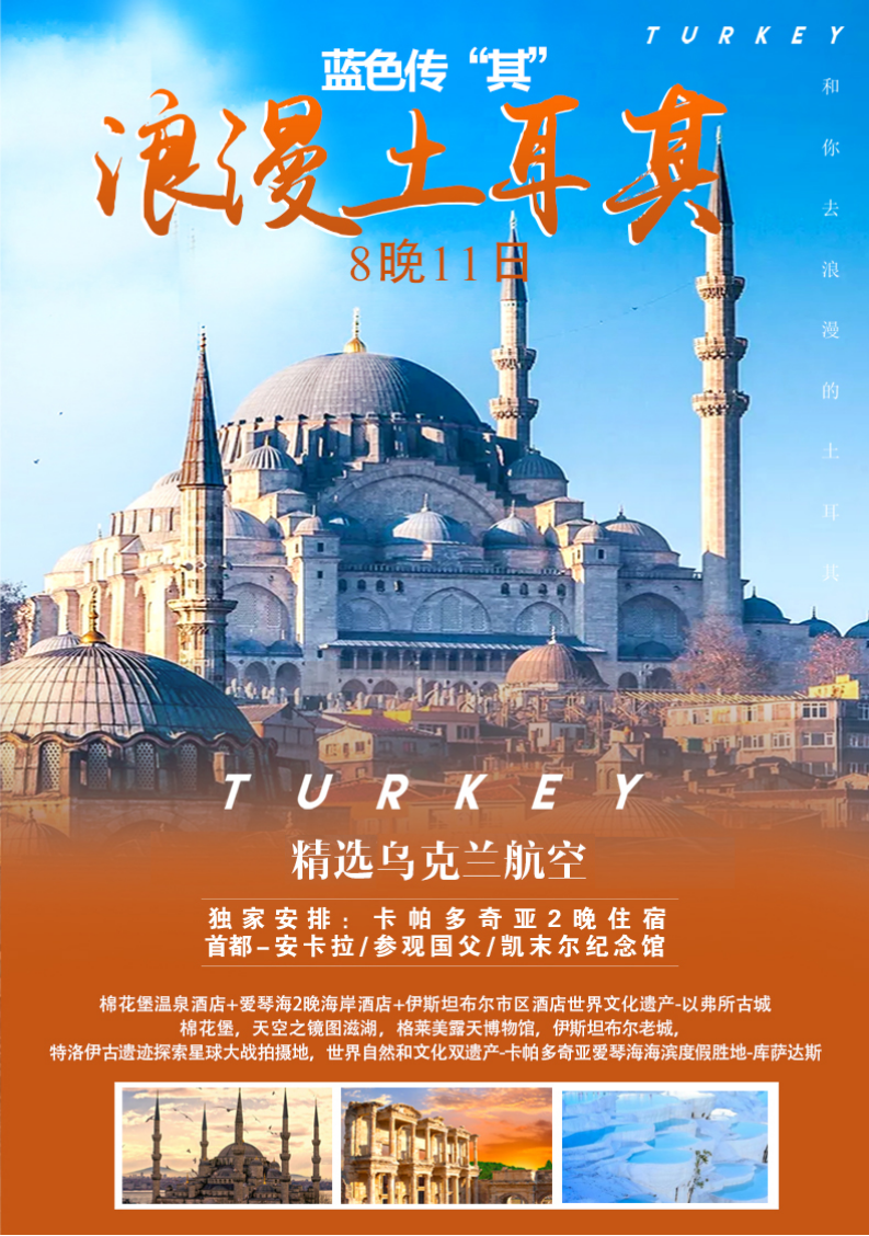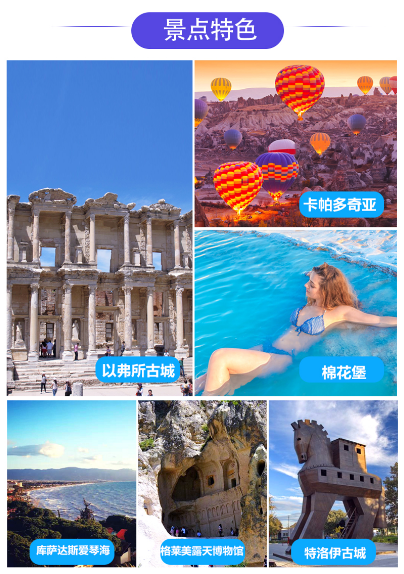 | 早餐后,开车前往世界七大奇观之一的棉花堡景区,棉花堡位于土耳其Denizli市的西南部,是远近闻名的温泉度假胜地,土耳其文Pamuk表示棉花,Kale表示城堡,所以Pamukkale就叫棉花堡。途中用午餐,抵达后开始游览【棉花堡景区】(入内游览时间约:2小时左右),超过30度的热水从地底冒出来,再沿着山边流下,在逾100公尺的山坡上形成无数大小水池,由于池内含有大量石灰质的矿物,因而又形成一层层奶白色梯田,从两千年前希腊时代起这里就成为风靡一时的温泉疗养胜地!之后游览【希拉波利斯古城遗址】。此城在棉花堡山顶的另一边,是著名古罗马的遗迹。它与棉花堡地质奇观咫尺之隔,是古代丝绸之路的重要站点,1988年被列为世界文化遗产。这里有异教徒、罗马人、犹太人和早期基督教徒的各种风格,并且融合成了一个安纳托利亚式的整体。之后前往特色棉纺店参观(时间约1.5小时左右),之后乘车前往库萨达斯,抵达后使用晚餐之后入住酒店休息。小贴士:库萨达斯-帕姆卡莱正常行车时间约3小时左右。温馨提示:棉花堡酒店内可免费泡温泉(视酒店营业温泉时间而定),故可建议客人自带泳衣泳帽,因在酒店内购买泳衣价格很贵。温泉区使用浴巾请自带,如需使用酒店内浴巾单独支付费用,请知晓。棉花堡酒店无电梯,如需行李员搬运行李,建议支付礼节性小费 |