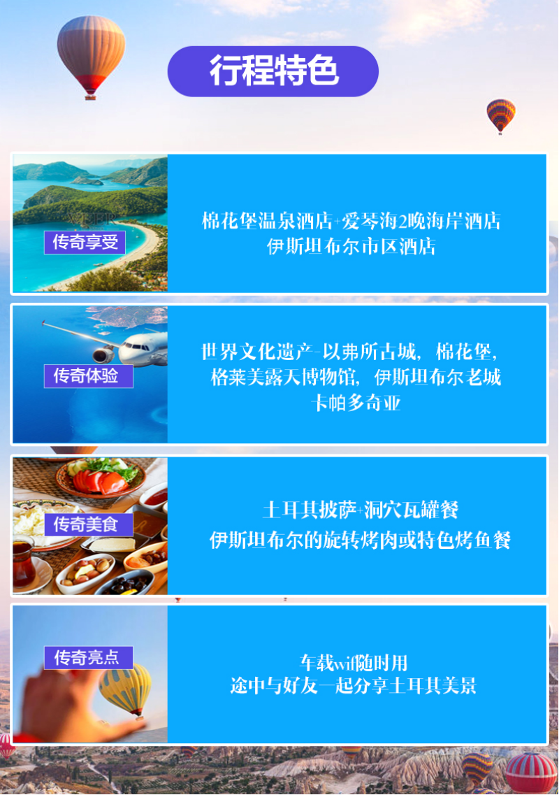 | 早餐前,自愿参加【热气球之旅】!(如因天气等不可抗力因素影响无法正常飞行,则取消该自费项目,费用退还!)卡帕多奇亚与肯尼和南非齐名,是世界上玩热气球最受欢迎的三个地方之一,游人在此可以乘坐热气球观看卡帕多奇亚全景。早餐后,参观【格莱美露天博物馆】(入内游览时间约:1小时),基督教初创的时候,在中东备受打击,而安纳托利亚高原就成了基督教徒传道和喘气的窗口,而卡帕多奇亚更是基督教徒重整的关键见证。这里集中了众多的岩窟教堂,尽管入口并不显眼而且丑陋不堪,但这里的教堂内仍保留那些年代久远而装饰精美的壁画,尽管有些已经斑驳模糊,人物和故事都需要尽力去分辨,但少数还保留着当年艳丽的颜色、完整的形象。之后前往陶瓷店欣赏各种陶瓷(时间约1.5小时)随后我们将会走入著名的【地下城】(入内游览时间约:1小时)迄今为止,在卡帕多奇亚已经发现的地下城多达36座。地下城的入口很隐蔽,走入盘旋的石梯后就进入了只可勉强供一人通过的窄道,通道时宽时窄,大部分时间只能弯着腰或蹲着前进。一个个迷宫般的房间相互连接,一直蔓延至地心深处。之后前往BIZ HALI 地毯店或其它地毯店(游览时间约1.5小时左右)。之后参观【乌其萨天然奇石景观城堡区】(约30分钟)随后游览【鸽子谷】(约20分钟)。【精灵烟囱】(约20分钟)独特的自然景观,由慢慢风化的岩石组成。之后乘车前往酒店。温馨提示:如果客人在境内报名热气球,我社会给客人预定在卡帕多奇亚第一天飞的热气球,若因天气等不可抗力因素影响无法正常飞行,需在第二天重新报名预定,可能会因热气球位子紧张而无法乘坐,费用退还,请客人谅解! |