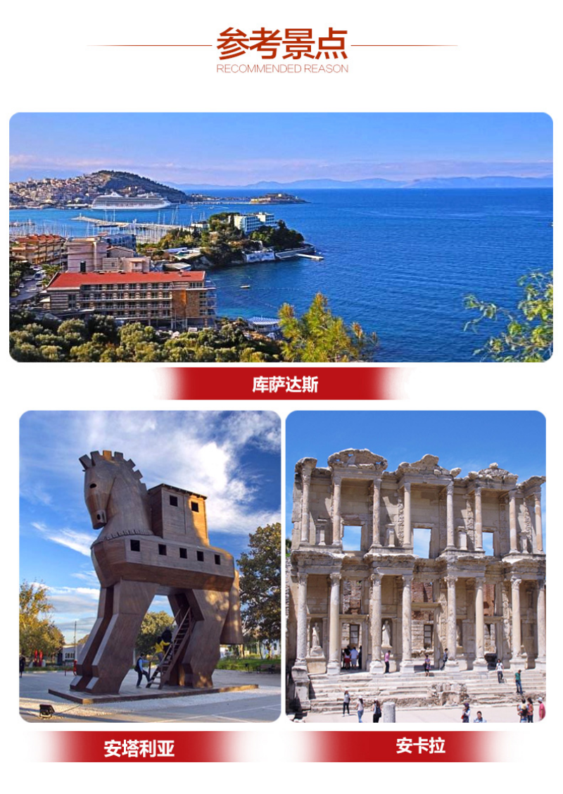 | 早餐后乘船经过【达达尼尔海峡】,前往恰纳卡莱,抵达后乘车前往【特洛伊古城】,参观著名荷马史诗中的伟大著作之一《伊利亚特》中所述说的有关远古时期因希腊皇后海伦而引发的一场特洛伊古城的十年战争现场,还可以观赏到因“木马屠城记”而获胜的【巨大木马】(入内游览时间约:30分钟)。古城曾以古代文明的中心闻名,美女海伦、特洛伊王子还在耳边细语当年特洛伊木马的传奇。之后前往艾瓦勒克,晚餐后入住酒店休息。小贴士:伊斯坦布尔-恰纳卡莱的正常车程约5小时左右。恰纳卡莱-艾瓦勒克的正常车程约1.5小时左右。 |
