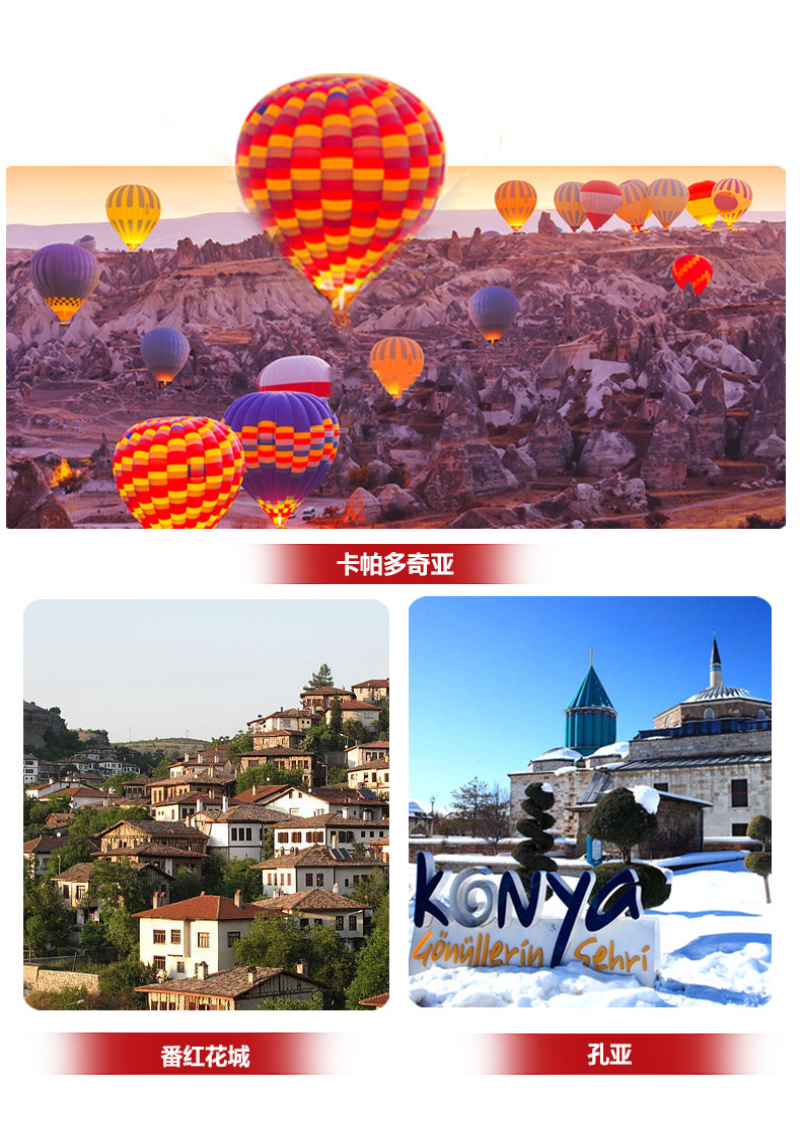 | 早餐前,自愿参加【热气球之旅】!(如因天气等不可抗力因素影响无法正常飞行,则取消该自费项目,费用退还!)卡帕多奇亚与肯尼和南非齐名,是世界上玩热气球最受欢迎的三个地方之一,游人在此可以乘坐热气球观看卡帕多奇亚全景。早餐后,参观【格莱美露天博物馆】(入内游览时间约:1小时),基督教初创的时候,在中东备受打击,而安纳托利亚高原就成了基督教徒传道和喘气的窗口,而卡帕多奇亚更是基督教徒重整的关键见证。这里集中了众多的岩窟教堂,尽管入口并不显眼而且丑陋不堪,但这里的教堂内仍保留那些年代久远而装饰精美的壁画,尽管有些已经斑驳模糊,人物和故事都需要尽力去分辨,但少数还保留着当年艳丽的颜色、完整的形象。之后前往陶瓷店欣赏各种陶瓷(时间约1.5小时)随后我们将会走入著名的【地下城】(入内游览时间约:1小时)迄今为止,在卡帕多奇亚已经发现的地下城多达36座。地下城的入口很隐蔽,走入盘旋的石梯后就进入了只可勉强供一人通过的窄道,通道时宽时窄,大部分时间只能弯着腰或蹲着前进。一个个迷宫般的房间相互连接,一直蔓延至地心深处。之后前往BIZ HALI 地毯店或其它地毯店(游览时间约1.5小时左右)。之后参观【乌其萨天然奇石景观城堡区】(约30分钟)随后游览【鸽子谷】(约20分钟)。【精灵烟囱】(约20分钟)独特的自然景观,由慢慢风化的岩石组成。之后乘车前往酒店。温馨提示:因土耳其热气球旺季来临!热气球位子非常紧张,国内报名的热气球也无法保证一定能安排。请客人谅解! |