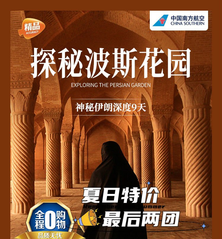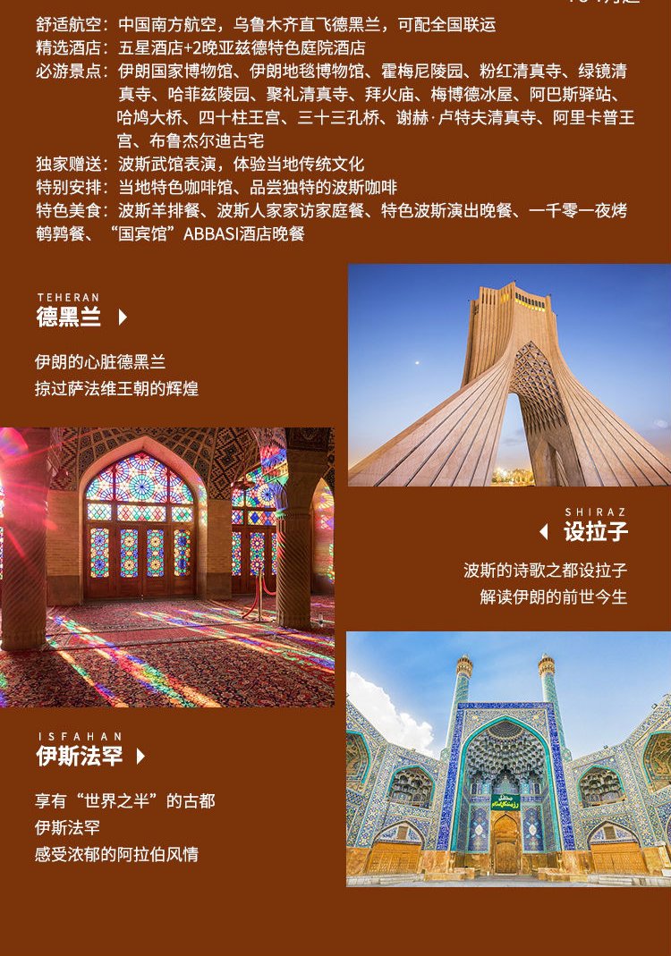 | 酒店早餐后,乘车前往卡尚(行车约 3 小时)【布鲁杰尔迪古宅】(约 30 分钟)气派宏伟,精雕细琢,拥有三座高 40 公尺的风塔,是传统波斯建筑的经典之作。这座住宅最初有两个部分,但今天只有 biruni 对外开放,andaruni 作为卡尚文化和遗产办公室所在地而不接受公众参观。布鲁杰尔迪古宅围绕一系列相通的庭院而 建,以精美的灰泥镶板、浮华的彩色玻璃以及高松的风塔作为装饰,和其他古宅一起,见证了卡尚作为恺加时期贸易中心的重要地位。【费恩庭园】(约 1 小时)占地 2.3 公顷,花木扶疏,流水潺潺,与其他共九处波斯花园共同列入 2011 年世界遗产名单。这里可能是伊朗同类庭园中保存最好的一座。这座具有 1200 多年历史的古典波斯天堂美景原是 为阿巴斯国王一世设计的,一直以其自然喷泉而受到称誉。这座葱郁的花园是阿巴斯一世设计并修建的,是波斯花园的典范。花园周边区域水资源奇缺,但花园内的水却相当的充裕,花园内的杉树最老的已经有 500 年的历史,茂密的橘子树在花开的时候香气袭人。与其他共九处波斯花园共同列入 2010 年,费恩花园被联合国教科文组织列入世界文化遗产名录。 乘车返回德黑兰(行车约 2 小时),前往机场。22:05 搭乘中国南方航空公司 CZ6026 返回乌鲁木齐 |