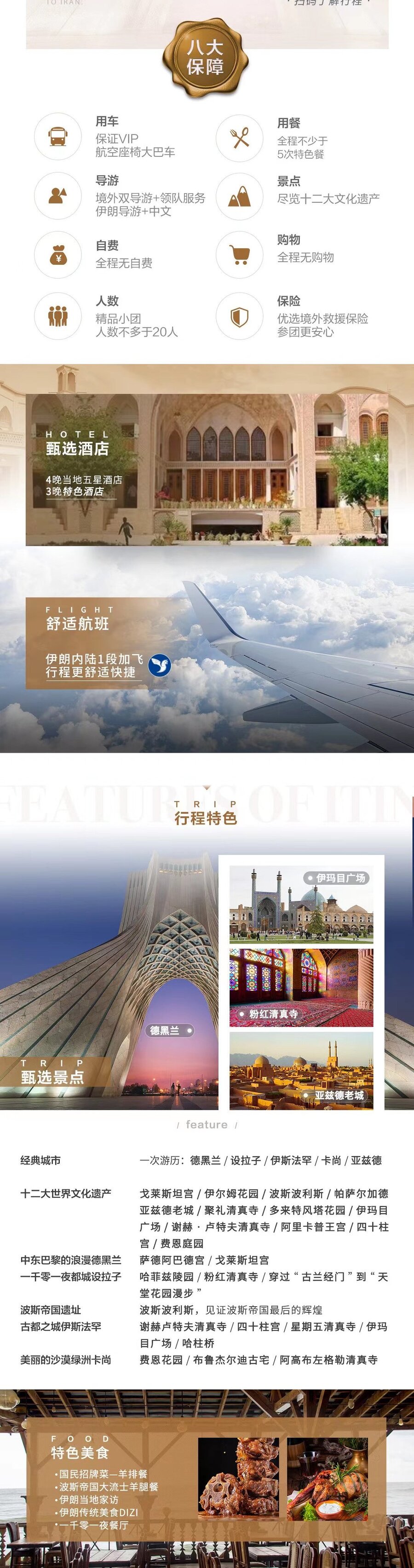 | 早餐游览聚礼清真寺(Zamah Mosque)(游览时间约 30 分钟),世界物质文化遗产之一,是名副其实的伊斯兰建筑博物馆,在几个小时内,便可对比 900 年间的伊斯兰设计--每栋几乎都是当时巅峰之作的典范。随后前往伊玛目广场(Imam Square)位于伊斯法罕市中心,面积仅次于北京天安门广场,位居世界第二。原名为国王广场,伊斯兰革命后改名。1979 年被列入世界遗产。游览伊玛目清真寺((Masjed-e Emam,约 30 分钟),是波斯建筑的典范和世界最美的清真寺之一,已被录入世界遗产。正门与主体偏角的巧妙设计、蜂窝状门廊拱顶及釉砖、内部蓝色瓷砖是这座清真寺的三大亮点。谢赫·卢特夫清真寺(Sheikh Lotfolah Mosque,30 分钟),是皇室家眷专用的祷告场所,建于 1602年,建造工程长达 17 年之久,设计师是伊斯兰学者谢赫·劳夫,清真寺也因他而得名。阿里卡普王宫(Ali Qapu Palace,30 分钟)建成于 17 世纪初,是伊斯法罕最高的建筑,也是萨法维时期在艺术和建筑领域最有价值的文化遗产。伊斯法罕大巴扎(Bazzar,游览时间约 1 小时)17 世纪中东最大的商业中心,由无数个街巷组成的大迷宫,巴扎盖有拱顶,各种中东货物琳琅满目。今日安排羊蝎子羊腿餐。温馨提示:伊斯法罕到卡尚参考行车距离 208 公里,参考行车时间 2.5 小时(单程) |