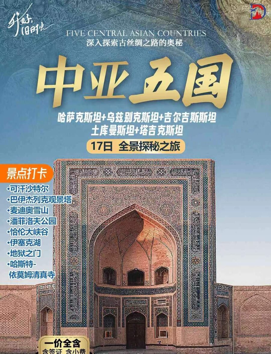 <中亚五国>哈萨克斯坦+乌兹别克斯坦+吉尔吉斯斯坦 土库曼斯坦+塔吉克斯坦17日 全景探秘之旅