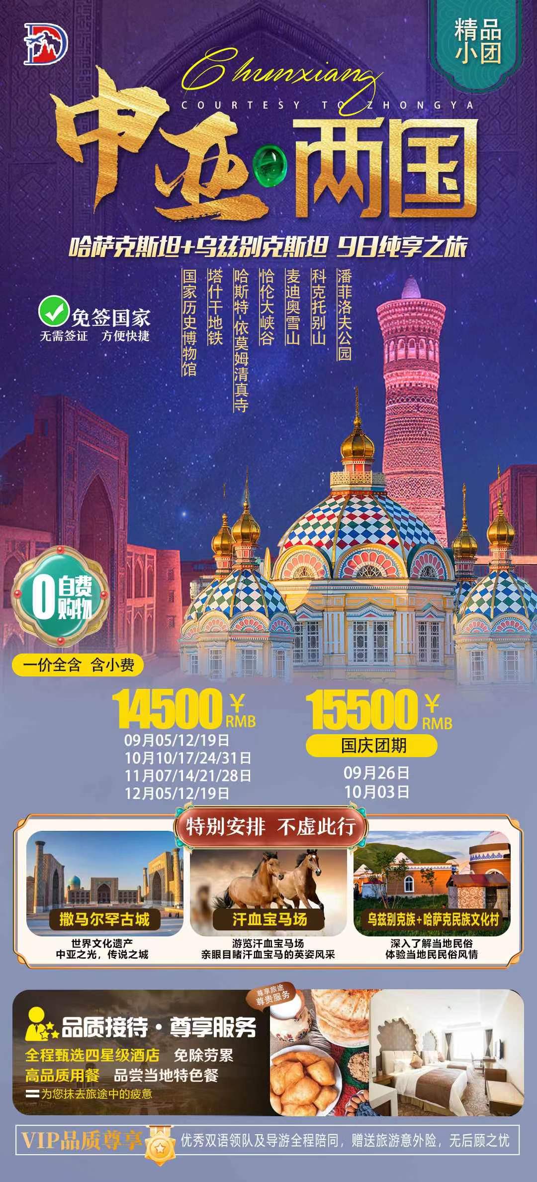 <中亚2国>哈萨克斯坦+乌兹别克斯坦 9日纯享之旅 0自费0购物 全程四星