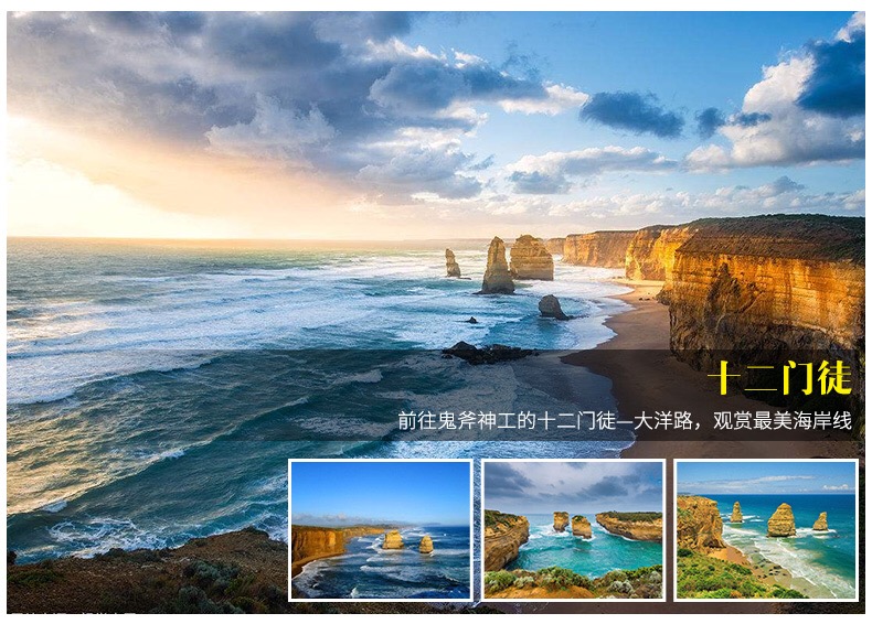 | 酒店早餐后,乘车前往享有“世界八大奇迹”之称的十二门徒。到那里感受海洋与礁石的美感,在此留下您的倩影。十二门徒石是大洋路的精华和代名词,它也是澳大利亚最盛名远播的自然景观之一。十二门徒石是一组穿出南大洋水面巍然耸立的巨型岩石,是坎贝尔港国家公园的中心看点。十二门徒石形成于海水对石灰岩悬崖的侵蚀。在过去的1000-1200万年里,南大洋的风暴和充满爆炸力的大风,慢慢地侵蚀着这些松软的石灰岩悬崖,在悬崖上形成许多洞穴,洞穴逐渐变成拱门。当拱门坍塌后,这些高达45米的巨石就被从大陆岸边分离出去。温馨提示:今天车程较长,比较辛苦,请您做好准备! |