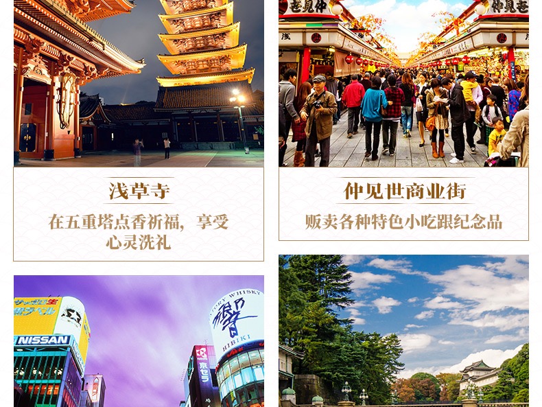 | 早餐后,前往浅草雷门观音寺祈福,仲见世小商品街观光(不少于40分钟)远观东京晴空塔(不登塔),感受世界第一高塔的魅力。乘车前往富士山地区,来平和公园,这里汤泉映粉,与富士山遥相呼应,美不胜收(不少于40分钟)。特别安排登临富士山五合目,与日本神山零距离亲密接触(不少于30分钟)。后乘车前往中部地区,入住酒店休息。(方便游玩,本日晚餐自理)温馨提示:如遇富士山封路或天气原因不能参观,则改为参观富士山资料馆,特此说明。浅草寺仲见世街:浅草寺是东京都内最古老的寺院。入口处挂着写着“雷门”字样的巨大灯笼这里的象征,仲见世街是浅草寺前贩卖各种当地小吃及手工艺品的商店街,约300米的路上,挤满了100多家店铺。东京晴空塔:东京晴空塔,又译为东京天空树,其高度为634米,于2011年11月17日获得吉尼斯世界纪录认证为“世界第一高塔”,成为全世界最高的自立式电波塔。平和公园:平和公园是典型的日式庭园建筑,广植各种树木及花卉,仿如人间美境。这里也是远观富士山的最佳地点,天气晴朗时,富士山的壮丽景色可一览无遗。富士山:被日本人民誉为“圣岳”,是日本民族的象征。富士山由山脚到山顶分为十合,由山脚下出发到半山腰称为五合目,利用巴士可上到2305米的五合目,这里的景色一年四季随季节变化而不同,日出日落,气候变化,都会令富士山瞬间呈现不同的身影,千姿百态! |