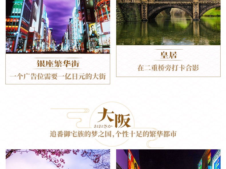 | 早餐后,前往京都,特别安排游览两大世界遗产—金阁寺(不少于30分钟)、清水寺及坂道街(不少于40分钟),古韵和风感受优雅,漫步祗园古街,找寻艺伎时代风情(不少于40分钟),当晚入住酒店休息。(方便游玩,本日晚餐自理)金阁寺:因为建筑物外包有金箔,故名金阁寺。金阁寺的建筑与园林构造相融合,成为京都的代表性景观,并作为日本国宝被收录进世界遗产名录。清水寺及坂道街:作为日本国宝被收录进世界遗产名录的清水寺,本身就是一首婉转流淌的风物诗,歌唱着古都京都的旧貌新颜,一砖一瓦都记录着这里岁月的变迁。徜徉在安静祥和的坂道街,信手买来浓郁当地特色的纪念品,古刹,坂道,美景,路人,美好的一切令旅人流连忘返。 |