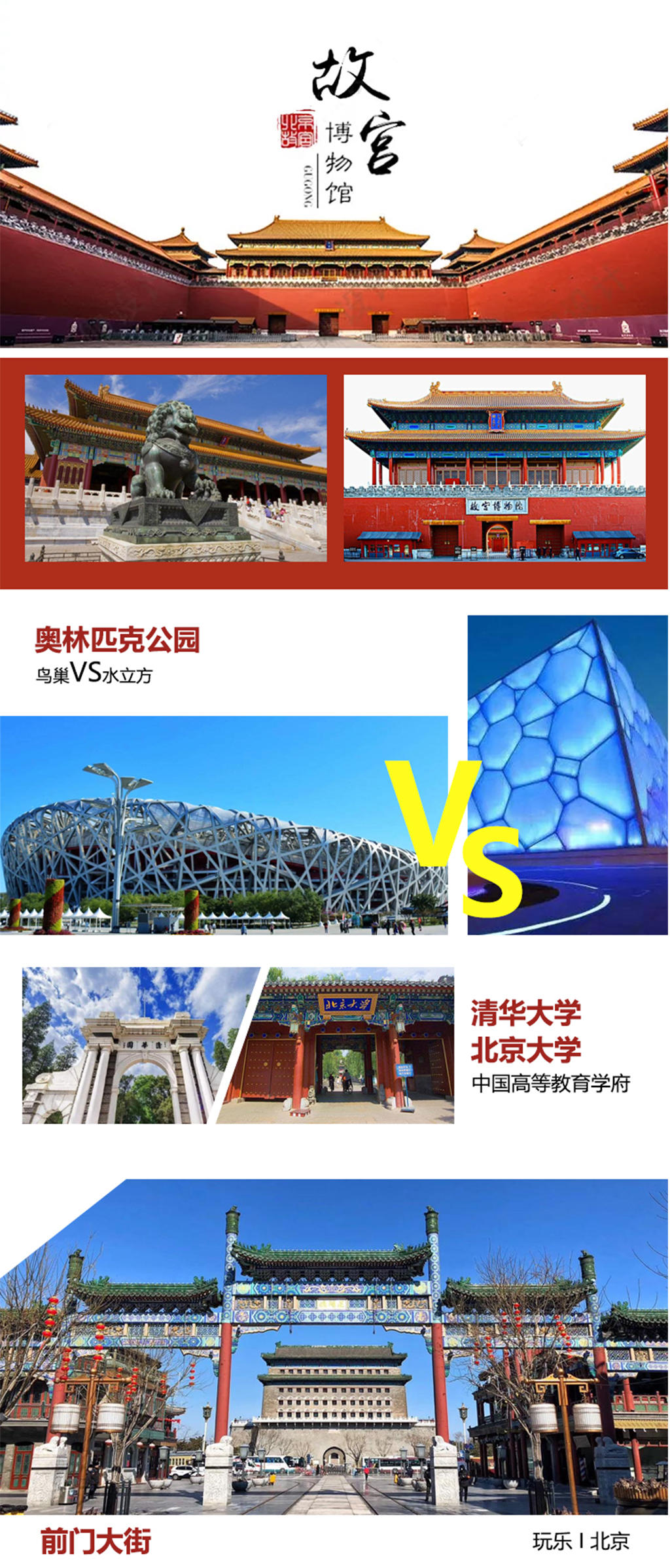 | 上午:赴明清两代帝王祭祀皇天、祈五谷丰登之场所---【天坛】(首道门票)。天坛在1998年被联合国教科文组织确认为“世界文化遗产”。07年5月8日,天坛公园正式批准为国家5A级旅游景区。后了解世界非物质文化遗产--德茂山河或和雅非遗古文化馆。门口拍照留念。游览皇家园林、中国四大名园----【颐和园】(含景区大门票,其"十里青山行画里,双飞白鸟似 江南"的秀美景色尽收眼底),颐和园整个园林艺术构思巧妙,在中外园林艺术史上地位显著,是举世罕见的园林艺术杰作!中午:品味传统风味北京烤鸭餐下午:后参观【中柬建交文化中心】,柬埔寨特产展示中心,每人可免费领取一条健康手伴方巾,这里是中国和柬埔寨建交62周年的友谊见证,周总和西哈努克亲王建立了一段特珠的友谊,为缓解柬埔寨经济压力,在中国外交部和商务部的帮助下无偿将文化中心借给柬埔寨政府。车览军事博物馆外景,北京南中轴线起点永定门城楼外景、游览随后参观我国最高级院校—【清华大学或北京大学】外景。(晚餐自理) |