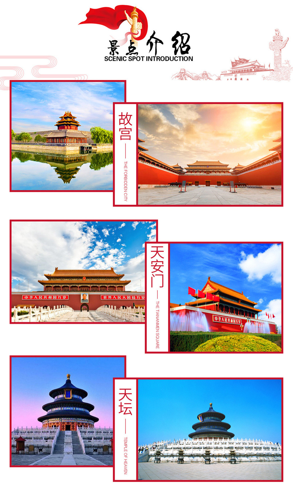 | 上午:早起参观庄严神圣的【升旗仪式】(因升旗时间早,打包早餐),游览世界上最大的城市中心广场-【天安门广场】—面积达44万平方米,可同时容纳100万人举行盛大集会,被评为“北京十六景”之首。参观庄严肃穆的【毛主席纪念堂】(客流量大,参观排队时间长;遇到政策性关闭,观外景),外观人民英雄纪念碑,国家博物馆外景,人民大会堂外景,远观中国国家大剧院外景。参观世界文化遗产---【故宫博物院】(2小时)北京故宫是中国明清两代的皇家宫殿,旧称紫禁城,位于北京中轴线的中心,是中国古代宫廷建筑之精华,北京故宫是世界上现存规模最大、保存最为完整的木质结构古建筑。北京故宫被誉为世界五大宫之一(北京故宫、法国凡尔赛宫、英国白金汉宫、美国白宫、俄罗斯克里姆林宫)。中午:中餐精选北方饺子宴感受家的味道下午:游览【什刹海风景区】—北京内城唯一一处具有开阔水面的开放型景区,景区内有北京最古老的胡同,观银锭山”、“柳岸风荷”等景观享有百年美誉;众多名人故居、王府等古迹散落其中,也是北京城内面积最大、风貌保存最完整的一片历史街区,在北京城规划建设史上占有独特的地位。周边的古建筑使景区依然保留着老北京的味道,置身漫步其中,体验老北京人的生活。独家赠送:【恭王府】,位于北京市西城区柳荫街,国家5A级旅游景区、全国重点文物保护单位,为清代规模最大的一座王府,是中国首家以王府文化为特色的国家级王府博物馆。随后前往金街--王府井步行街。打卡【和平菓局】一座老北京城带着浓浓的年代感扑面而来。大青砖窄胡同儿、蜂窝煤、小马扎、绿皮火车、大戏院、照相馆还有上世纪的广告画……(晚餐自理)特别提示:1、毛主席纪念堂凭本人有效证件参观,瞻仰毛主席遗容请按工作人员指定位置排队入场并保持次序2、毛主席纪念堂不得携带大小包、照相机、水壶等入场参观,请交至导游看管后再排队参观,期间每人都需进行景点安检。3、天安门广场人流量大,请注意看管自身的行李物品,以免丢失。4、故宫博物院自2014年1月1日起,每周一全天闭馆,如遇闭馆则根据实际情况调整行程,敬请谅解5、故宫博物院自2015年6月13日起实行实名制携带二代身份证购票,请客人一定要带身份证件才能入馆,如因客人自身原因没有带身份证件造成无法入馆的情况,后果客人承担,如果遇见学生儿童没有身份证件的请带户口部或者护照入馆。 |