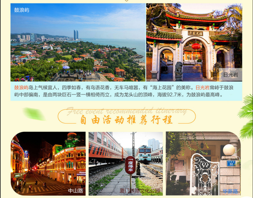 | 美美一觉醒来后,有条不紊,稍作整理,自由活动一天。也可参自愿参考【鼓浪屿一日游】要在报名前就确认好。厦门鼓浪屿一日游1. 【行程安排】约定时间在邮轮中心码头集合,在导游带领下乘渡轮前往“海上音乐花园”---【鼓浪屿,】(时长约20分钟),沿万国建筑博览线参观【英、日领馆】、【黄荣远堂外景】、【海天堂构外景】、【天主教堂】,领略古今中外别具风格的各式建筑,纪念“万婴之母”的【毓园】 。2.后于【港仔后沙滩】自由活动(游览时间不少于3小时)或在鼓浪屿最繁华的商业街--龙头路自由逛街鼓浪屿上自由活动,享受快乐的自由时光。3.根据导游约定的时间地点集合(16:00左右,如下午出发航班,则以实际集合时间为准),一起乘轮渡返回厦门市区。以上行程为参考行程,供应商将根据实际情况(如鼓浪屿过渡时间点)调整游览顺序【因台风原因,鼓浪屿部分路段景点不开放,实际游览时间在确保安全的前提下,以当天实际安排为准】。注:鼓浪屿禁止扩音器讲解,游客需自行租用无线耳麦,不租用者请靠近导游听讲解2. 【船票说明:】鼓浪屿往返过渡团队票(须团进团出)1)游客因自身原因,需要自行离团,需与导游签《离团保证书》;2)同一团队的游客,必须跟随团队一起检票乘船,离开团队,单独乘船者(注:鼓浪屿返程)需要另行购买18元/人返程票,费用游客自理;3)船票当天当班航次有效,过期自动作废,开航前10分钟停止检票,请游客提前30分钟抵达登船码头集合。因游客未按照与导游约定的时间到达集合地点而造成鼓浪屿岛因此产生的损失,将由客人自行承担;4)每张身份证每天只能预订一次,每次预订一张,每个身份证订单只做一次领取,往程(进鼓浪屿)请按预订的日期、航次登船,身份证包含有效订单时不可再次预订。5)请每位登船游客必须携带预订时所填写的身份证原件出行,儿童需提供户口本原件。①迟到或未携带有效证件,非本人有效证件,视为自动放弃该产品,所有损失游客自行承担。②由于船票座位有限具体船班以供应商通知游客出行航班为准,如出现航班调整敬请谅解。6)1.2米以下儿童可免票上岛,需携带身份证或户口本,如报名时未说明携带儿童及儿童身高,导致超高无法上岛,我司不承担任何责任。3.【费用包含】1)往返团队船票(团进团出)2)导游服务费3)旅行社责任险 |