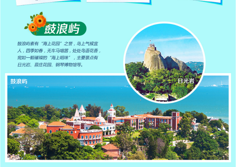 | 早餐后,前往【南普陀寺】(游览时间约50分钟)厦门著名古刹,居于鹭岛名山五老峰前,背依秀奇群峰,面临碧澄海港,风景绝佳。始建于唐代,为闽南佛教胜地之一。适时乘轮渡前往“音乐之岛”—已含【鼓浪屿】(游览时间约3小时),登上钢琴码头,遥看具有“小白宫”美称的【八角楼】,沿万国建筑博览线参观英、日领事馆,黄送远堂,天主教堂。【毓园】(游览时间约20分钟)毓园之"毓",就是培育养育之意,故纪念园取名毓园,寄托了家乡人民对林巧稚大夫的崇敬之情。港仔后沙滩海滨浴场(自由活动30分钟)适时下岛。晚上可自行前往中华十大名街----中山路自由活动,品尝当地小吃注:厦门鼓浪屿属半开放式自由商业区,请客人自愿按需购买与我社无关,我社为纯玩无购物。鼓浪屿轮渡票每日限流,提前预定周期长,不能确保轮渡票的上岛时间,以轮渡公司最终安排为准调整行程顺序,谢谢理解。祝旅途愉快。 |