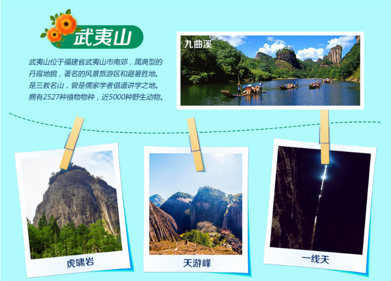 | 请于当天下午13:00在北京西客站北广场国旗旗杆下认找“福建旅游”、蓝底白字导游旗 乘Z59特快直达列车(14:47)赴武夷山 (备些:晕车药、常用药、南方多雨、加些长袖) |