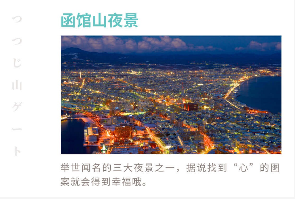 | 早餐后,乘车来到函馆,游览参观【托拉比斯契诺女子修道院】以及【元町公园(旧租界地)】(不少于30分钟),晚上前往函馆山乘缆车欣赏世界三大夜景之一的【函馆山夜景】(含缆车往返费用)(不少于40分钟),与璀璨夜色亲密约会。当晚入住酒店休息。【元町公园】老城区一带保留着许多旧建筑物,其中有国家级重要文物的旧函馆区公会堂、带欧洲风格饮茶室的原英国领事馆、函馆东方正教派的教堂和东本愿寺的分寺等,留下了日本文化和西方文化交融的独特气氛。托拉比斯契诺女子修道院位于静谧的半山腰,周围风景秀丽,安静优美,是函馆一道美丽的风景线。【函馆山夜景】因形似卧倒的牛,被称为卧牛山。全长835米的架空索道可以把游客带到海拔332 米高的山顶上。从全天候型的展望台可以眺望函馆港与街市,南至下北半岛、津轻半岛都能尽收眼底。与香港和那不勒斯并称为“世界三大夜景”的函馆夜景,点缀着海上隐约的点点渔火,堪称为人间一大绝景。 |