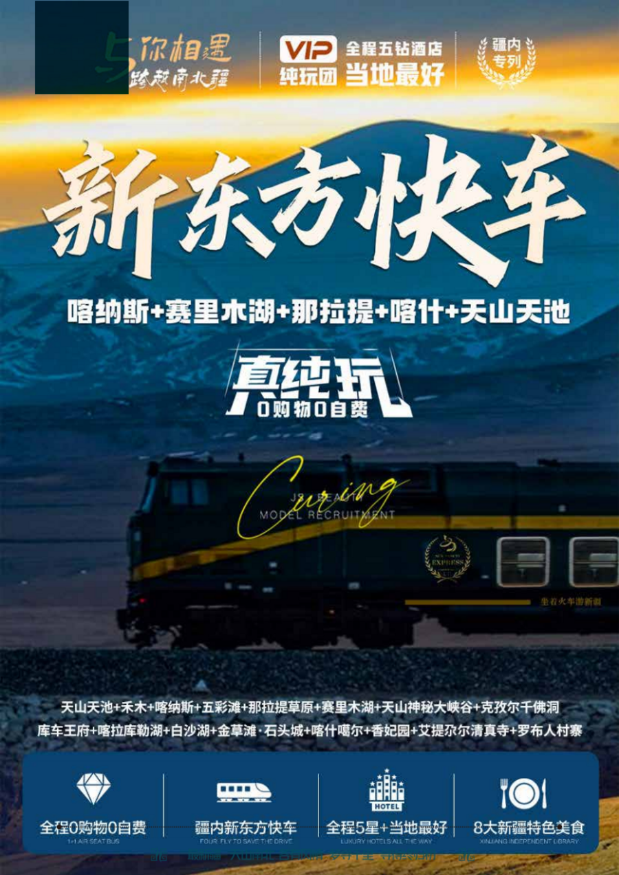 | 酒店早餐后前往【霍尔果斯口岸】(中哈合作区 游览时间约2.5小时),中哈霍尔果斯国际边境合作中心是建立在中哈两国霍尔果斯口岸的跨境经济贸易区和区域合作项目,是中国与其他国家建立的首个国际边境合作中心,也是上海合作组织框架下区域合作的示范区,中哈合作中心是世界上首个跨境自由贸易区。后前往【赛里木湖】(游览时间3.5小时)古称“净海”,是新疆大西洋暖湿气流最后眷顾的地方,有“大西洋最后一滴眼泪”的说法。来到这里恍若梦境,湖水非常清澈,清得可以看到湖底大大小小的灰色石头。湖的两岸群山环绕,山上是绿油油的草地,树木茂盛,花草遍地。太阳一照,水变的五颜六色,一阵微风吹来,水面波光粼粼,我们站在湖边,呼吸着新鲜的空气,人也变得很清爽美好。结束晚餐后乘新东方快车赴库车! |