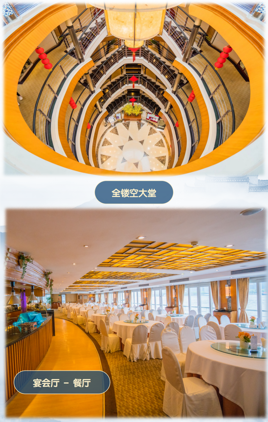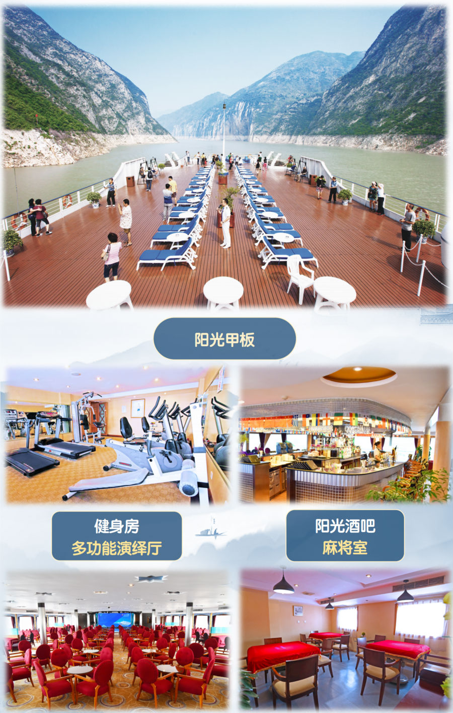 | 06:30-07:00 游轮– 晨间咖啡茶点(五楼逸景咖啡厅)07:00-08:00 游轮 - 自助早餐(二楼巴楚风情餐厅)08:00-10:30 自选自费上岸游览–【丰都鬼城】丰都鬼城,一座起源于汉代的历史文化名城,被人们传为“鬼国京都”、“阴曹地府”,成为人类亡灵的归宿之地。它不仅是传说中的鬼城,还是集儒、道、佛为一体的民俗文化艺术宝库。12:30-13:30 游轮-自助午餐(二楼巴楚风情餐厅)15:00-16:00 游轮 - 巴楚特色下午茶(五楼神女酒吧)重庆-宜昌,一路风景不同风情各异,赏美景品悠闲下午茶16:30-17:30 上岸游览【石宝寨】包含长江第一云梯古镇国家4A级景区,古为巴州之西界,与长江明珠--石宝寨隔江相望。西沱历史文化悠久,这里是水陆贸易、烟火繁盛、俨然沼邑。是长江上游重要的深水良港,2015年12月西沱古镇入选长江三峡30个最佳旅游新景观之一。17:30-19:00 游轮–自助晚餐(二楼巴楚风情餐厅)19:30-21:00 游轮–船长欢迎酒会(五楼神女酒吧)友情提示:1、游船每天的景点为游船公司统一安排,根据游船公司停靠来决定游览那个景点或者参加那个自费景点,因此停靠景点也不同,请以船方最终安排为准,旅行社无能力更改,请您周知)2、船方推荐的自费景点为自愿参加不强迫,不参加的贵宾可在房间休息、甲板遛弯,参加的客人前台处报名(每天游船上会有广播通知,景点游览时间,报名人数,成团基数等以船方当日安排为准。自费推荐景点在不达最低人数要求时,则此景点放弃参观)。3、船票为打包价格,包含船上用餐,住宿,3个景点;无任何证件优惠退免!!自费景点船上的实际收费为准!(包括游船码头停靠费、车费、导服、门票等综合费用) |