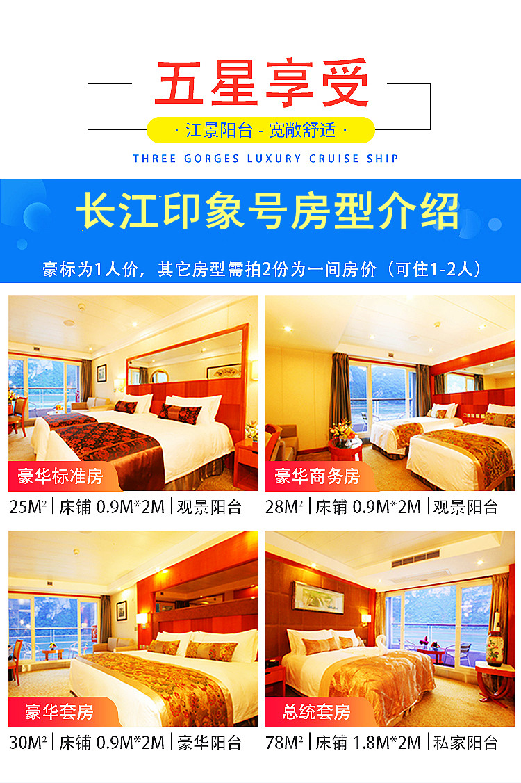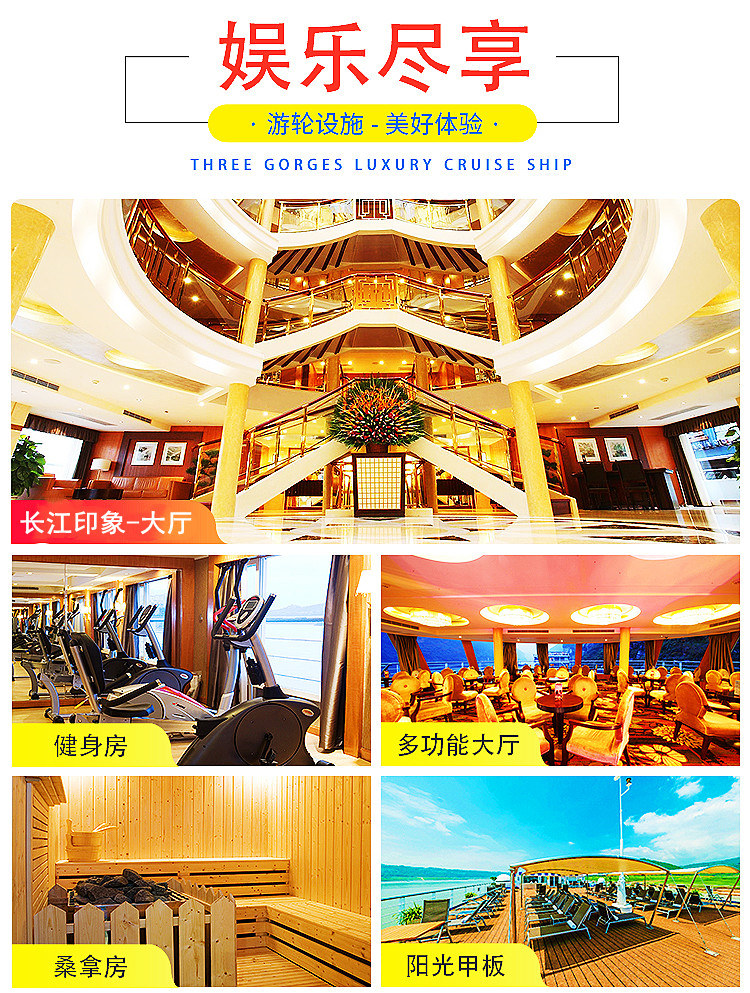 | 08:00-11:00 乘车参观国家5A级土家风情【三峡人家】三峡人家融合地质文化、巴文化、楚文化、土家文化、峡江文化、抗战军事文化,原生态、场景式、体验型大型民俗旅游区。依山傍水,风情如画,传统三峡吊脚楼点缀于山水之间,久违的古帆船、乌篷船安静地泊在三峡人家门前,溪边少女挥着棒槌在清洗衣服,江面上悠然的渔家在撒网打鱼……12:00-13:00 享用陆地中餐13:10-16:00 前往游览国家5A级【三峡大坝】,登上5A级旅游景区坛子岭观景点你能鸟瞰三峡工程全貌,体会毛主席诗句“截断巫山云雨,高峡出平湖”的豪迈情怀;整个园区以高度的递增从上至下分为三层,主要由模型展示厅、万年江底石、大江截流石、三峡坝址基石、坛子岭观景台等景观。 185观景平台位于三峡大坝坝顶公路的左岸端口处坝顶齐高,同为海拔185米而得名。(进入大坝前将进行安全扫描检查,请勿携带剪刀,指甲刀,酒类及易燃易爆物品)(电瓶车10元/人自理)16:30-18:30 在船自由活动或自愿自费报名参观自选乘坐国家4A级【三峡垂直升船机】,290元/人,三峡升船机全线总长约5000米,船厢室段塔柱建筑高度146米,最大提升高度为113米最大提升重量超过1.55万吨,承船厢长132米、宽23.4米、高10米,可提升3000吨级的船舶过坝。这些数据显示三峡升船机是世界上规模最大、技术难度最高的升船机工程。亲身体验水涨船高的震撼,也是全世界唯一近距离观看三峡最大奇观圣地18:30-20:00 宾客陆续登船办理入住,20:30-21:00 安全说明会(五楼 神女酒吧)友情提示:1、游船上每天景点为游船公司统一安排,根据游船公司停靠来决定游览那个景点或者参加那个自费景点,因此停靠景点也不同,请以船方最终安排为准,旅行社无能力更改,请您周知2、船方推荐的自费景点为自愿参加不强迫,不参加的贵宾可在房间休息、甲板遛弯,参加的客人前台处报名(每天游船上会有广播通知,景点游览时间,报名人数,成团基数等以船方当日安排为准。自费推荐景点在不达最低人数要求时,则此景点放弃参观)。3、船票为打包价格,包含船上用餐,住宿,3个景点;无任何证件优惠退免!!自费景点船上的实际收费为准!(包括游船码头停靠费、车费、导服、门票等综合费用) |