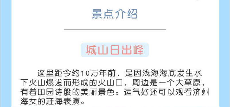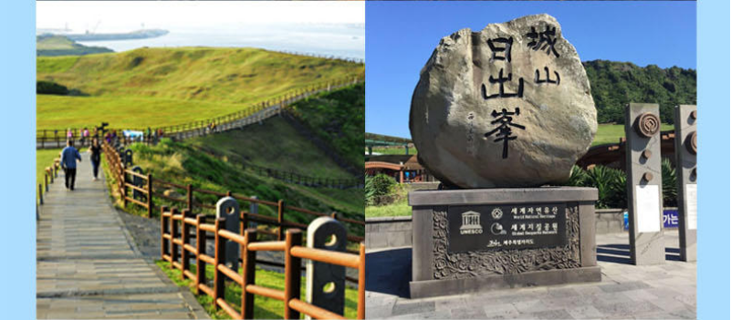 | 【城山日出峰】城山日出峰于2000年7月19日被指定为地方天然纪念物,2007年被联合国教科文组织指定为世界自然遗产。在日出峰顶观看日出,令人叹为观止的美丽和庄严,仿佛带你走进一个美妙绝伦的境地;峰顶上可看到海岸线辽阔的大海和草原上壮丽的田园风光。【涉地可支】涉地可支(Sopjikoji)位于济州岛东部海岸的一端。“涉地”是这一地区古代时的名称,“可支”是济州岛方言,意思是向外突出的地形。涉地可支所在的海岸悬崖上是一片宽阔的草地,这里一棵树也看不到,海岸上耸立着一块叫仙石的岩石。【橘园】橘子是济州岛的特产,济州岛的橘子产自济州的火山岩黑土,常年受到海风和雨水的滋养,异常的酸甜可口、多汁美味,做成橘子巧克力、橘子VC等,不仅美味还具有营养价值。【城邑民俗村】城邑民俗村完全反映了济州岛独特的居住文化。你在这里可以看到那看似堆得稀稀疏疏的挡风石墙(黑熔岩石),为了防止风直接进入里屋而建得又直又弯的“奥来”(窄胡同),还有成为济州岛之象征的石神像。【土特产品商店】在这里可以购买到韩国的特色产品,馈赠朋友是个不错的选择。 |