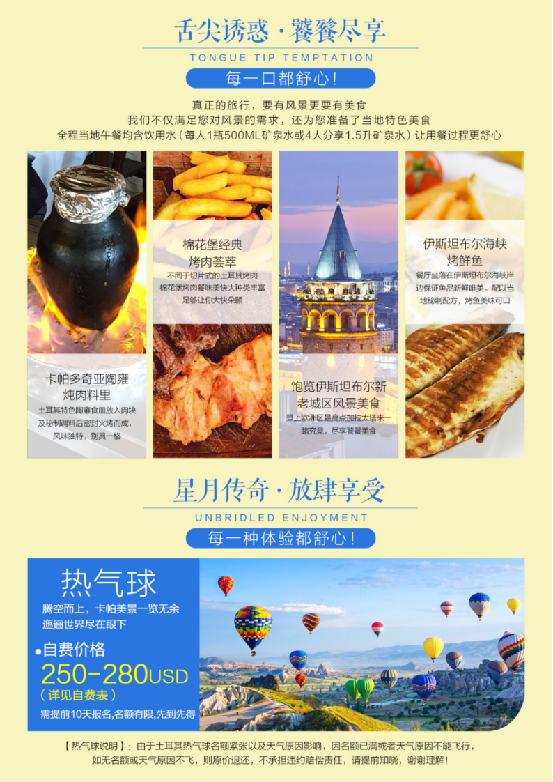 | 酒店早餐后,乘车前往卡帕多奇亚当地民居家中饮茶,体味热情好客的土耳其当地人民的真实生活(约40分钟)。之后参观蘑菇谷,骆驼岩,乌奇萨要塞,猎人谷(共约2小时),【格莱梅露天博物馆】(约1小时)作为土耳其的世界级文化遗产,格莱梅露天博物馆集中了数量众多的装饰着精美壁画的岩窟教堂和清真寺。岩窟教堂的石灰壁画,都是用石灰涂在墙上,在石灰潮湿的时候,把颜料调好后涂在石灰上,壁画的内容以圣经为主。前往当地【地毯店】,选购具有土耳其特色的地毯(约为1.5个小时)。前往【当地陶瓷店】,选购具有土耳其特色的陶瓷(约为1小时)。午餐特别升级洞穴餐厅内享用套陶雍炖肉料理(Uranos Sarikaya)。之后往【珠宝店】,挑选具有土耳其特色的珠宝饰品(约为1.5小时)晚上如有时间可观看土耳其著名的肚皮舞表演。【见行程后附件:行程外可额外购买特色项目】 【热气球购买说明】:1、 由于土耳其热气球名额有限以及天气原因影响,国内随团款报名的热气球客人不能保证一定安排在第一天飞行,因名额已满或者天气原因不能飞行,则原价退还,不承担违约赔偿责任,请提前知晓,谢谢理解!2、 国内报名热气球的客人如因名额已满或天气原因改签棉花堡飞行,费用不退境外签字确认同意改签棉花堡,如不改棉花堡飞行,费用回国后退回,不承担违约赔偿责任,请提前知晓,谢谢理解! |
